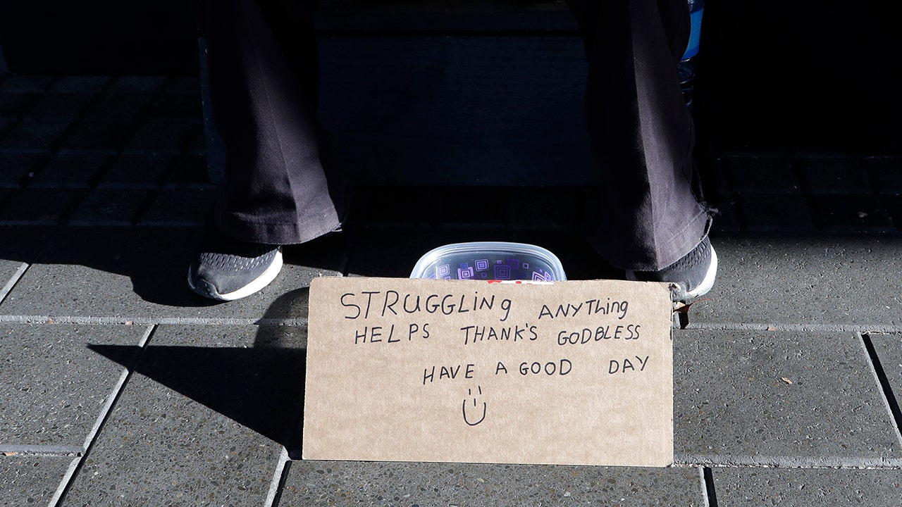 A man sits with a bowl asking for money in the central business district of Christchurch, New Zealand, Thursday, May 30, 2019. (AP Photo/Mark Baker)