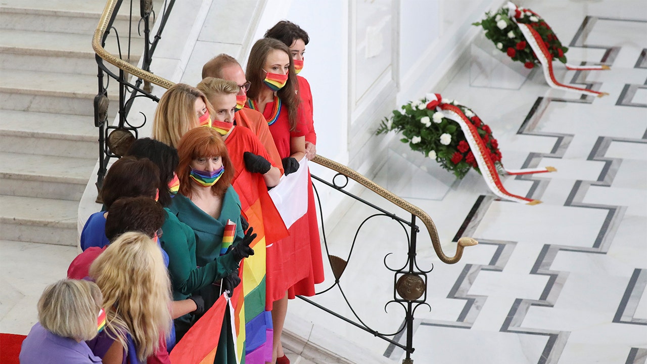 In addition, the opposition leaders wore colored masks and sat in rows as Duda was officially sworn in. They reportedly posed for photos outside parliament with rainbow and Polish flags as well.