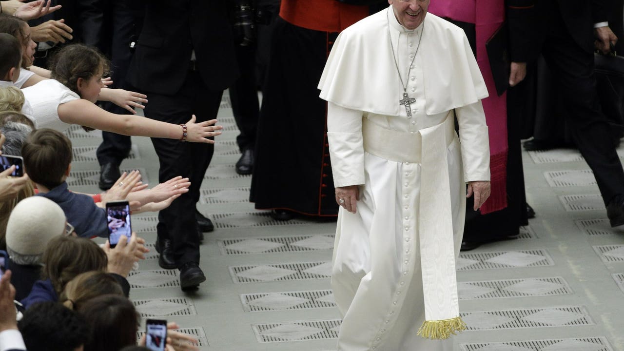 Pope Francis arrives for an audience with participants of a pilgrimage of the Italian-Albanian diocese of Lungro, in the Pope Paul VI hall, at the Vatican, Saturday, May 25, 2019. (AP Photo/Andrew Medichini)