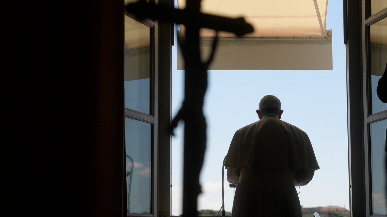 Pope Francis waves from his studio window overlooking St. Peter's Square at the Vatican on Sunday, July 5, 2020. (AP Photo/Riccardo De Luca)