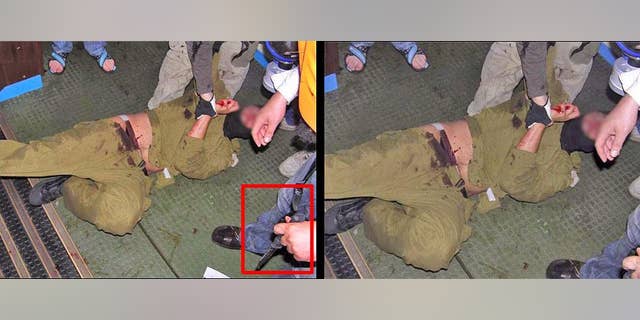In a second photo the unedited print issued by IHH showed blood along the ship's railing and a hand holding a knife as an Israeli soldier lies on the deck. Both the blood and the knife were missing in the photo that Reuters released.