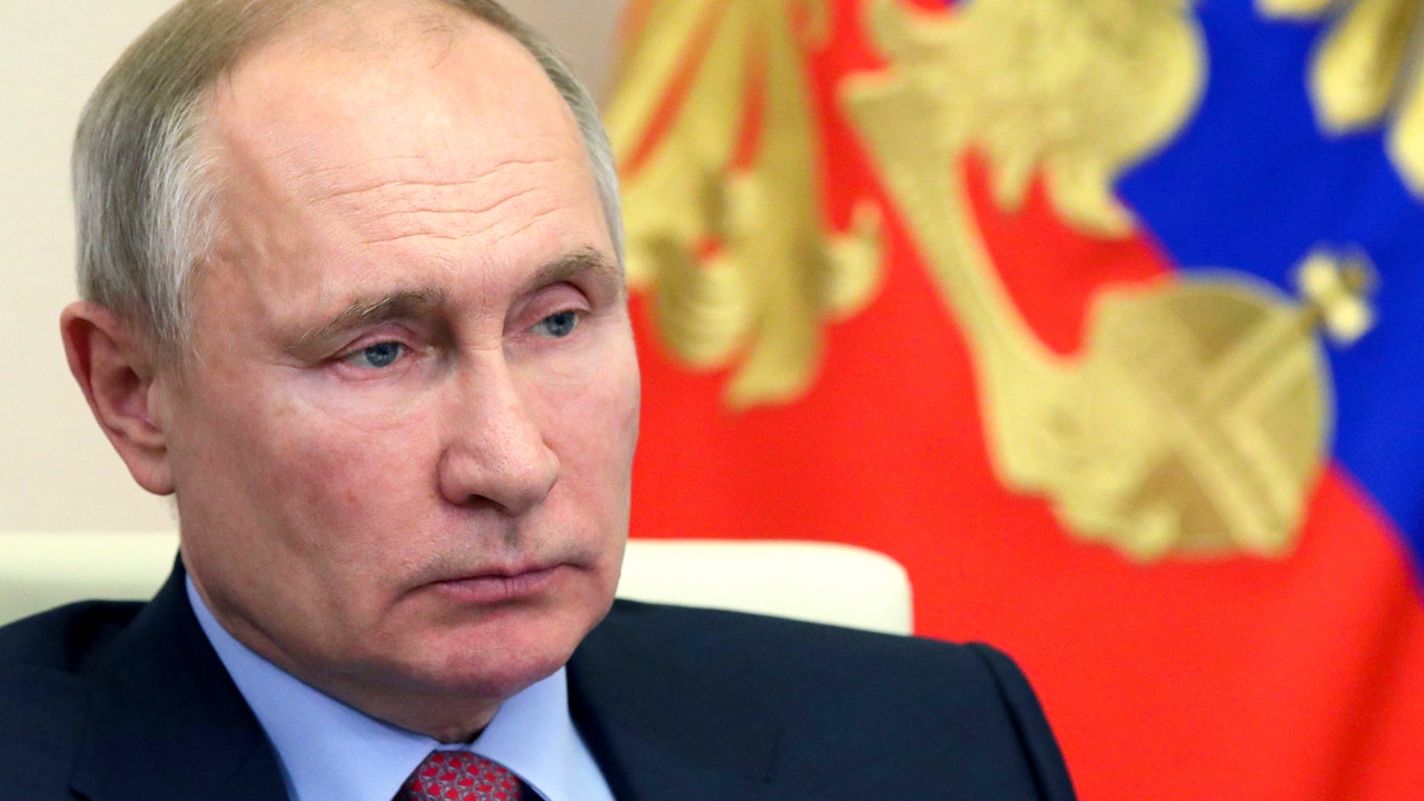Russian President Vladimir Putin attends a meeting via video conference at the Novo-Ogaryovo residence outside Moscow, Russia, Wednesday, Jan. 20, 2021. (Mikhail Klimentyev, Sputnik, Kremlin Pool Photo via AP)