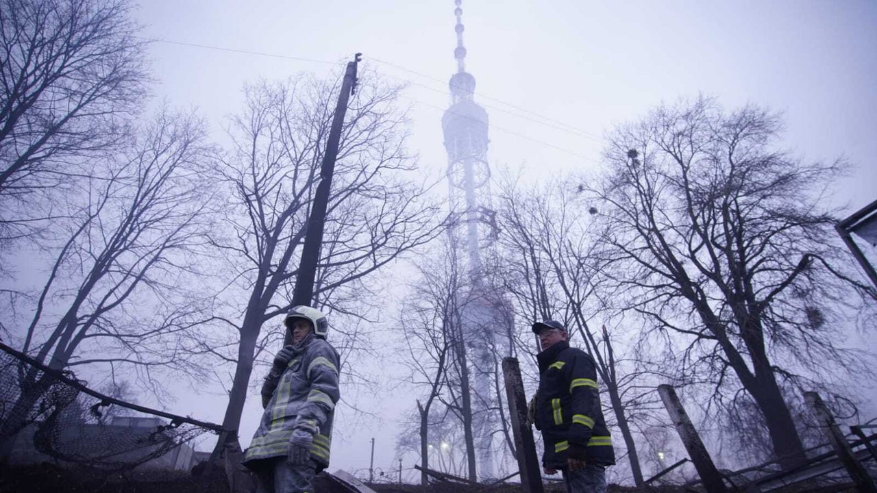 Emergency crews respond after a missile landed near Kyiv's TV Tower in Ukrainian capital, Kyiv on March 1, 2022. (Photo by Wolfgang Schwan/Anadolu Agency via Getty Images)