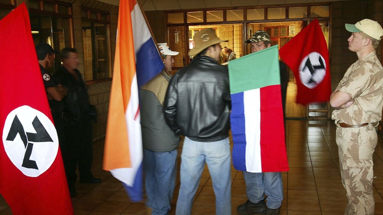 Supporters of the Afrikaner Resistance Movement (AWB) display an old South African flag, second from left, an old Afrikaner "Vierkleur" flag and swastika-like flags as they await the release of their leader, Eugene Terre'Blanche from prison in Potchefstroom, South Africa where he was granted parole after serving three years of an effective five year sentence for the 1996 attempted murder of a black security guard. (AP Photo)