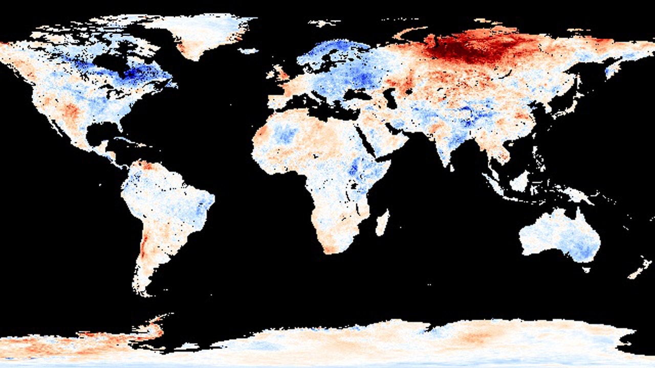 A global map showing places that are warmer (red) or cooler (blue) in May 2020 based on long-term averages. Much of Russia has seen above-normal temperatures since May. (MODIS/NEO/NASA)