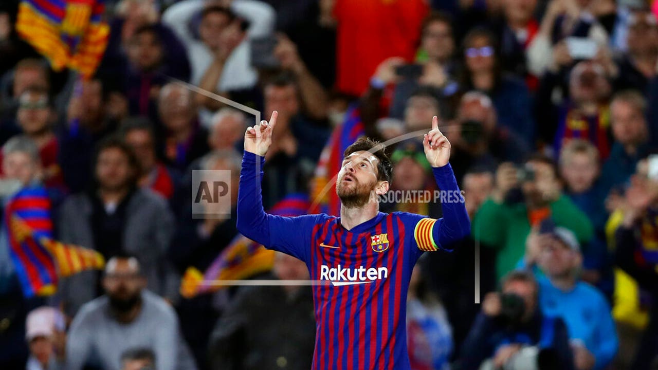 Barcelona forward Lionel Messi celebrates after scoring his side's second goal during the Champions League quarterfinal, second leg, soccer match between FC Barcelona and Manchester United at the Camp Nou stadium in Barcelona, Spain, Tuesday, April 16, 2019. (AP Photo/Manu Fernandez)