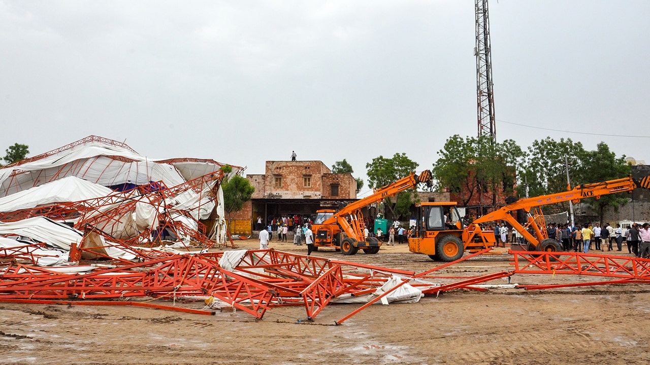 At least 14 people were injured and dozens hurt when heavy rain and a thunderstorm caused a massive tent to collapse in India as a religious event was being held inside on Sunday.