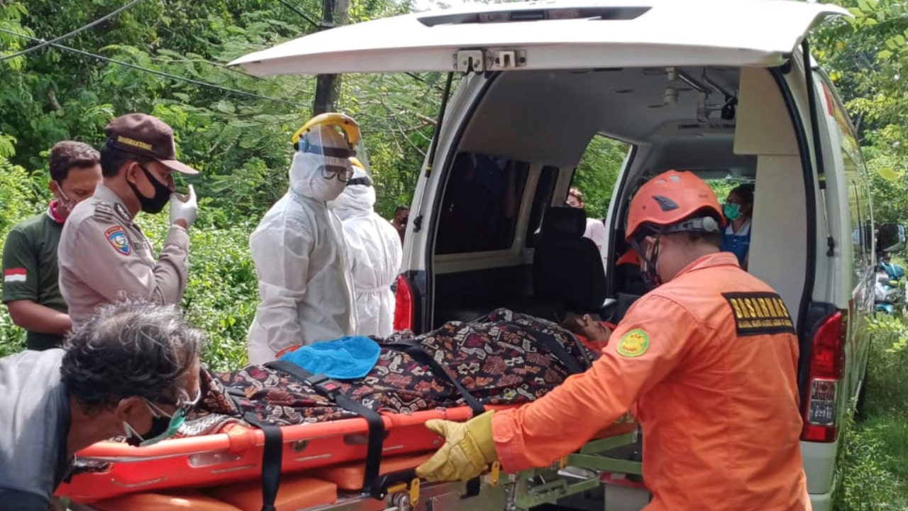 Rescuers carry Ukrainian man Roberts Jacob Matthews on a stretcher into an ambulance in Pecatu, Bali, Indonesia, on Saturday. (AP/BASARNAS)