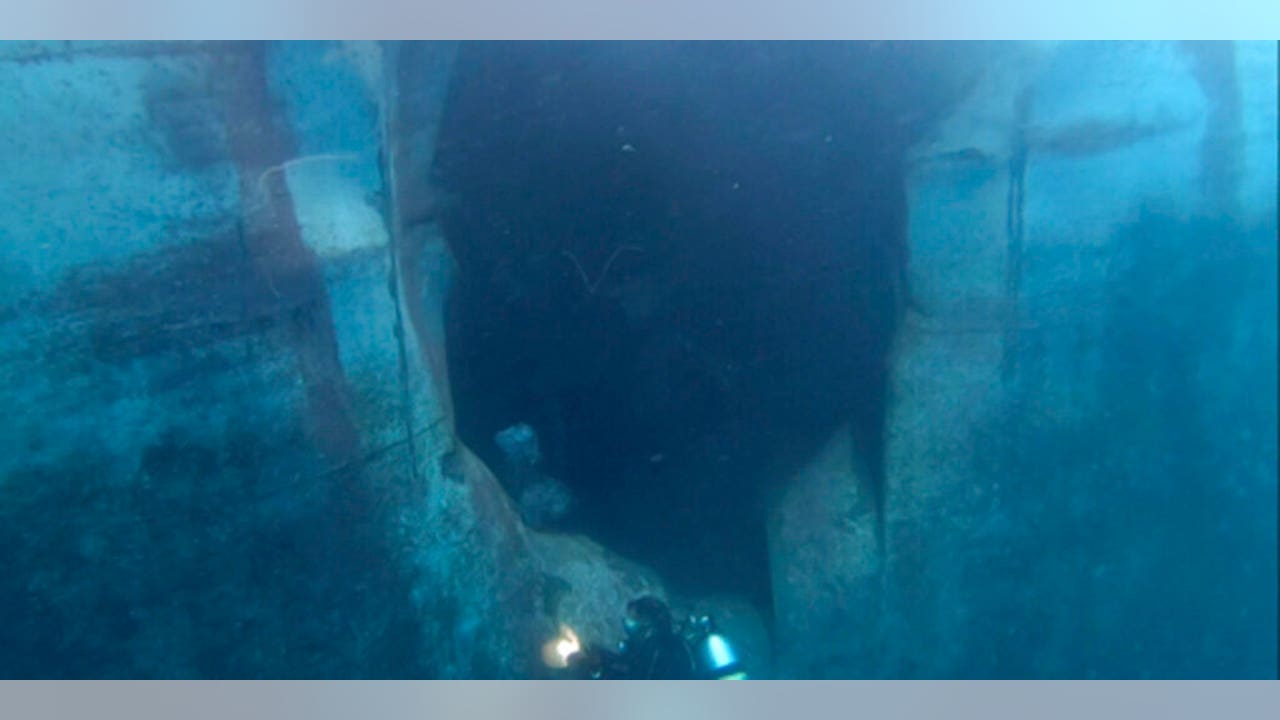 This undated photograph from the United Arab Emirates' Mission to the United Nations released Thursday, June 6, 2019, shows a diver investigating the damage done to the Saudi-owned oil tanker Al Marzoqah off the coast of Fujairah, United Arab Emirates. (United Arab Emirates' Mission to the United Nations via AP)
