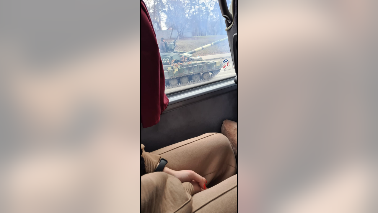 A Ukrainian tank passes a bus carrying travelers from Kyiv toward the border with Poland on Friday, Feb. 25, 2022. Hours later, fighting had reached Ukraine's capital city amid Russia's invasion of the country. (Courtesy: Kevin Flanagan)