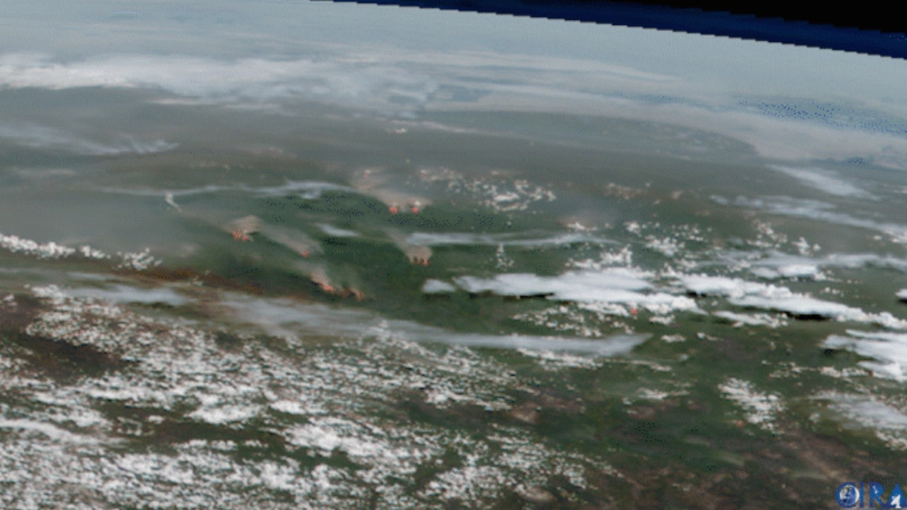 Flames and smoke were captured on satellite imagery as dozens of wildfires raged above the Arctic Circle in Siberia during a sweltering regional heat wave.